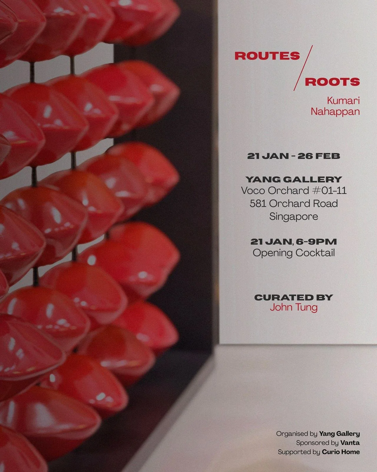 Colour remains a defining force within Nahappan's practice and assumes renewed significance in this body of work. Her employment of colour often saturated and symbolically charged operates as a connective register through which forms are grounded and enlivened. In bringing together this new assortment of works, Roots & Routes offers fresh insight into a practice shaped by the continual act of rooting and re-rooting, revealing how Nahappan's works remain embedded within history while remaining responsive to the world they inhabit.