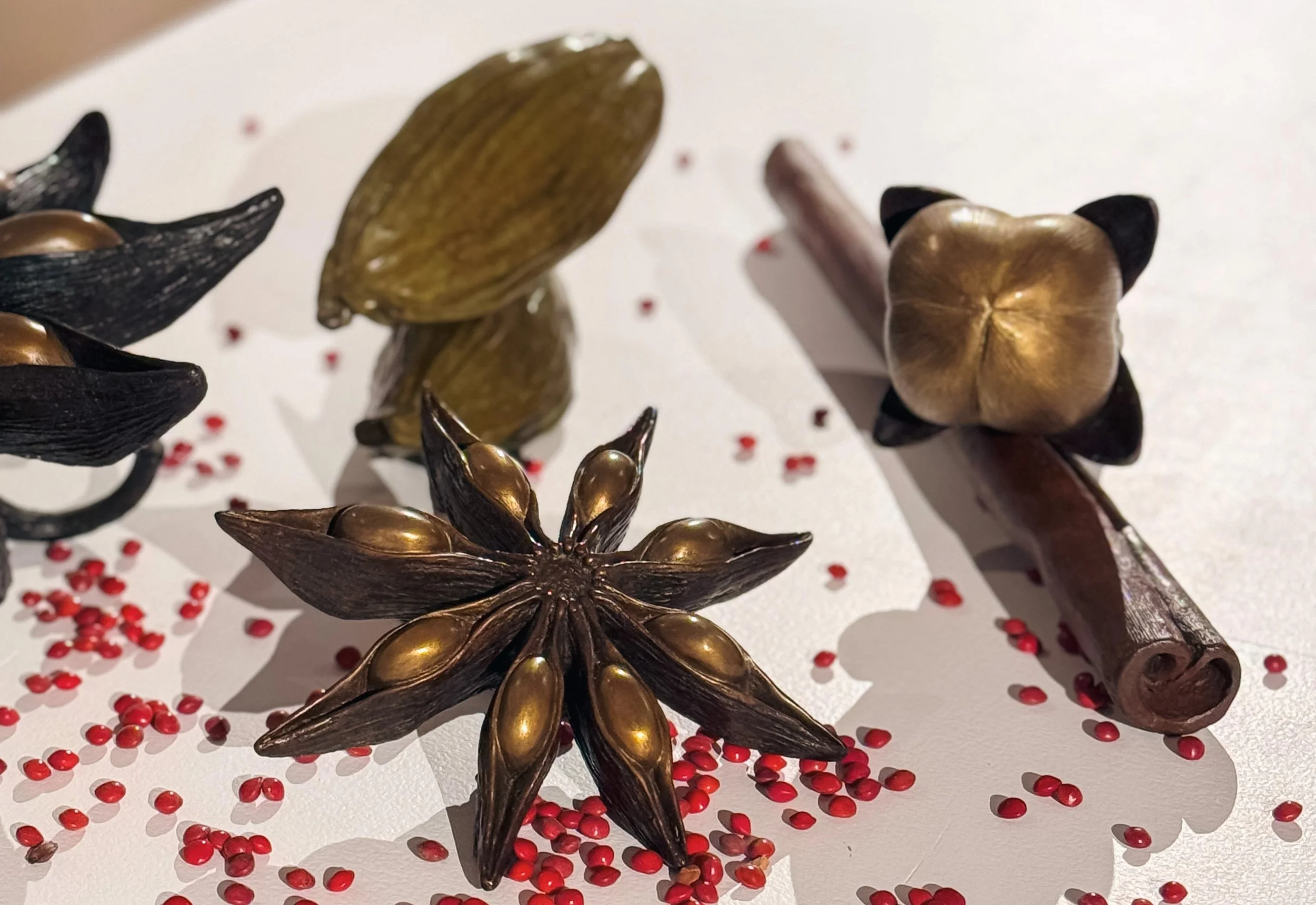 From the joyous Dancing Queen I & II, where pineapples curtsy in celebration of prosperity and hospitality, to the luminous Golden Rice Grain, magnifying an everyday staple into a radiant emblem of sustenance, each piece carries layers of meaning. Cosmic Conches: Bounty of the Sea stretches along the beachfront, its black-and-white conches evoking spiritual energy and the bounty of ocean life. Meanwhile, Echoes of Red pairs fiery bronze chilies with monumental saga seeds, their mirrored reflections in water evoking renewal, memory, and connection.